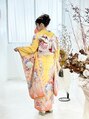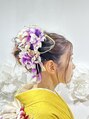 甘くなりすぎない高めのアップスタイルに大きめのお花をあしらって。帯結びは一部裏のピンクを見せたリボンアレンジで可愛らしさもプラス