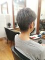 かりあげしないメンズショートカットです。メッシュキャップでブリーチしてグレーのカラーを入れています。