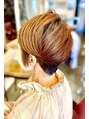襟足が浮く強いくせがありますがタイトにする事でうなじ美人になり後頭部のボリュームも際立って見えます。カラーはオレンジベージュです。【髪質改善 カット カラー 白髪染め トリートメント ショート 元町】