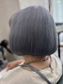 コロンとしたボブに青みの効いた明るいグレーで、冷たく澄んだ印象が強いカラー。白髪を生かした高明度寒色のトーンなので、透明感やクールな仕上がりに◎