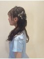 流行りのアースカラーにアッシュラベンダーを補色でいれたブラウンカラー。カットは軽い、ナチュラルロングスタイル。お花アレンジハーフアップ清楚でかわいいパーティーヘア
