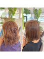 髪質改善ストレート。顔まわりと表面にハイライトが入っています。また、明るい白髪染めもしている状態からの髪質改善ストレート。少しのブリーチヘアでしたら、ストレートがかけられます。