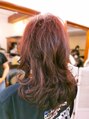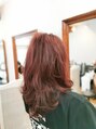 ロングレイヤーです。アンバーレッド系のカラーをしています。毛先は巻いています。