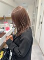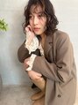ミディアムヘアのタイトなスタイルに、透明感のあるグレージュカラー。スタイリングはオイルで仕上げてウェットな質感で今っぽく。
