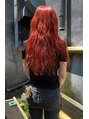 オレンジカラーに、ハイレイヤーロングスタイリングは動きを出してドライな質感でぼさっと