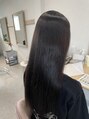 地毛に合わせて暗めにトーンダウンをしたいとのことで、毛先にブリーチ履歴が残っていたので、暗くくすみ過ぎないようにナチュラルなブラックに染めました♪日に当たるとほんのりこげ茶くらいです。美髪トリートメントでしっかり内部補修!サラ艶に感動します