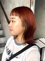 全体はブリーチなしダブルカラーでオレンジに、インナー部分はワンブリーチでくすみベージュにしました。オン眉フルバングの個性派ボブ♪