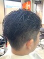 メンズ学生カット。かりあげとツーブロックでスッキリと。くせ毛を活かしたショートレイヤーと質感調整で軽く動きのある仕上がりに。ジェルワックスやワックススプレーで立体感を。
