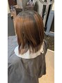アンブレラカラーです。表面のみブリーチ後、青紫の塩基カラー。濃いめにいれれば室内では目立ちすぎず。自然光では鮮やかに発色。ブリーチで白っぽくなるまで色を抜くのが綺麗に染める条件です。カットは顔周りレイヤーの外ハネボブです(^^)