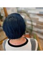 ショートからボブに伸ばしてる途中。下の長さを切りながら段差を少なく。一度フルブリーチ。前髪~顔周り~サイド~バックまで際の2センチ幅を、塩基性のブルー×グリーンでインナーカラー。ベースはアルカリカラーででインディゴネイビー。