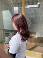 切りっぱなしのワンレングススタイルにチェリーピンクカラーで可愛らしさをプラス