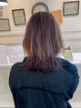 程よい軽さと動きが出るよう、毛先にニュアンスをプラスしたナチュラルミディアムスタイル。表面にはレイヤーを少し入れて、空気感と柔らかさを演出。肩に当たって自然にハネる毛先が、抜け感のある今っぽさを引き立ててくれます。