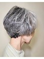 シニアショート。襟足、サイド共にスッキリさせ、トップにボリュームをだし、後頭部は丸く頭の形が良く見えるように。グレイヘアを染めずに活かす。