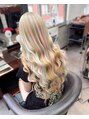地毛のミルクティーからエクステで長さをだしつつ水色とピンクのエクステでメッシュを入れています♪