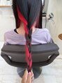ぱっと見はシンプルなロングストレートですが内側に仕込んだビビッドなピンクがとっても鮮やか♪ケアブリーチを使って丁寧に土台をづくり後カラートリートメントでしっかりと発色させました三つ編みにすると黒髪とのコントラストがはっきり出て◎
