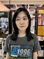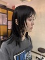 顔まわりにレイヤーを入れたストレートタッチのミディアムスタイル。暗めのカラーでも重たくならないように、レイヤーで軽さと動きをプラスして。