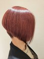 前下がりステップボブ。襟足は刈り上げ。鋭角な前下がりボブスタイル。イノアカラーの明るいレッドでビビッドに表現。ケラスターゼカクテルトリートメント施術。