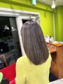 白髪をカバーしつつ、ハイライトで立体感を出したスタイル。ハイライトはブリーチを使わずに明るめのライトナーで馴染み感のあるスタイルに。ベースはやや明るめにして明度差を広げ過ぎないようにして、派手すぎに柔らかく馴染む立体感のあるスタイルに。