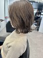 ベースは切りっぱなし外ハネにカット。顔まわり中心にレイヤーを入れて。パーマはカットを活かすように、柔らかく動きと毛流れが出るように。カラーは通常のカラーで透明感を出したベージュカラー。黄色味を抑えながらヘルシーで大人っぽい雰囲気に。