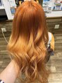 ブリーチしてオンカラー。夏にピッタリのオレンジグラデーションカラー。ビビットの根元オレンジに毛先は褪色や残留なども考えて少し薄めなオレンジに。