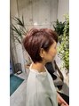 温かい色味を使った白髪染めです。カットは襟足を綺麗に見せて耳にかけられるショートスタイルです。