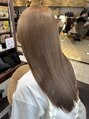 透明感たっぷりなのに、実はブリーチなしなんです◎しっかり赤みを抑えて、柔らかくまろやかな質感に仕上げました。髪質改善も一緒に行っているので、手触りもなめらかでサラサラ。自然なツヤが光を反射して、より立体的な仕上がりに!