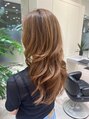 セミロングのレイヤースタイルに、ハイライトを入れたスタイルです。明るめのハイライトが、夏の日差しに映えます!コテ巻きで仕上げら事でさらにツヤが出て、カラーの印象が綺麗になります。