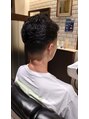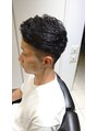 遊びと品格を兼ね備えた大人のためのウェーブショート。サイドはすっきりと刈り上げ、トップはパーマで柔らかいウェーブをプラス。清潔感と遊び心を両立させたスタイルです。顔周りの毛流れが、よりスマートな印象を与えます。ON/OFF問わずキマる万能ヘア