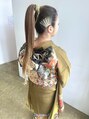 落ち着いたトーンのママ振りに今っぽいポニーテールアレンジです!金箔、水引き、ロープなど装飾品をゴールドで統一しています◎
