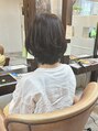 全体的に前下がりのラインでカットして、少し低めのローレイヤーを入れてます。最後の仕上げに32ミリのカールアイロンで毛先は外ハネ、上は内巻きにスタイリングしました。