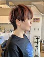 【気に入ったスタイルはブックマークをしていただくと便利です】カットはマッシュスタイルベースのくびれショート。髪色は表面部分のみブリーチ後、アプリコットオレンジをオンカラー。ハイライトのようなデザインカラーです。[薬院/警固][福岡ショート]