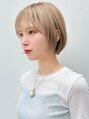 ブロンドベージュのフェイスレイヤーショートボブ。ブリーチ2回して、クリームベージュでオンカラー。カットは顔まわりを包むようにレイヤーを入れて完成