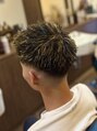 ハイフェードでシャープに仕上げた土台に、メッシュを効かせたツイストスタイルをオン。立体感と遊び心が共存した無敵のアップバング。エッジの効いたフォルムで横顔も映える、今っぽさ全開のバーバースタイル。スタイリング次第で印象チェンジも自在◎