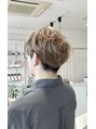 プレックスブリーチで17レベルまで明るくしています。セカンドカラーで柔らかいブロンドベージュに。カットはツーブロックと襟足を刈り上げ、前髪は鼻くらいの高さのセンターパートスタイル。クセを活かしてスタイリングすることでパーマ風に仕上げています。
