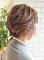 ショートレイヤー。襟足はタイトにスッキリさせ、サイドは小顔効果のある長さに設定。後頭部は丸く頭の形が良く見えるように。イノアカラーとハイライトの組み合わせ。