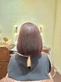 艶感重視の落ち着いた明るさの髪色、暖色系ラベンダーブラウンに前上がりのマッシュボブスタイルで髪の綺麗さを強調したヘアースタイルです。