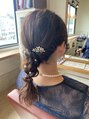 ローポニーテール風のアレンジで編み下ろし、パールやビジューのヘアアクセを散りばめた華やかなスタイル。上品で結婚式やパーティーにぴったりです。