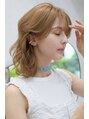 顔まわりにレイヤーで軽さを出しカラーはハイトーンのベージュで柔らかく。毛先をゆるく32ミリのコテで巻いて優しい雰囲気を出しています。