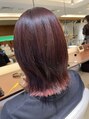 インナーブリーチ部分にビビッドな赤を効かせて、動いたときにしっかり映えるデザインに。表面は深みのあるバイオレット系で、艶と大人っぽさをプラス。スタイルは外ハネボブでカジュアルに。