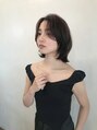 くびれボブミディアム。肩↑にカットして表面にレイヤーを入れてくびれシルエットで引き締まる印象に。前髪は流れるように毛流れしやすいようにカット。