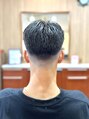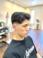 ボリュームが出やすいトップの収まりを考えて毛量調整し、スタイリングしやすく、低めにフェードを入れることでスッキリとスタイリッシュな印象に。クリーム系のワックスでツヤ感と広がりを抑えた仕上がりに。