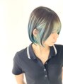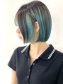 アンブレラカラー&ボブにターコイズブルーで。トップだけ残してアンダーはブリーチで明るくベースアップ。夏にぴったりな爽やかな色彩とパッツンとしたカットラインのボブがオシャレで可愛い。