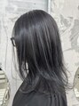 ケアブリーチで全体にハイライトを入れて、濃いブルーでネイビーカラーに◯カットは切りっぱなしで、スタイリングは、ストレートアイロンやコテで軽く外ハネにして、オイルをサラッとつけるだけでOKなスタイルです!