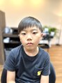 サイドをツーブロック、バックを刈上げでスッキリと。左右非対称に段差を入れてカットし毛量調節で軽くしたキッズアシメスタイル