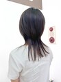 前下がりのレイヤーウルフカットです。前が長くなることで、小顔効果もあります。クールで大人っぽいスタイルです。ハイライトを入れています。レイヤーで生まれる髪の段差にハイライトが入ることで、より陰影が際立ち、立体的なシルエットになりました。