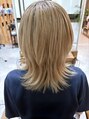 少し重めウルフにカット。前回暗染め履歴があった為優しめのブリーチで色を抜き上から薄くカラーを入れブロンドに寄せました。