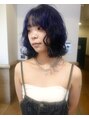 ブリーチ1回のネイビーブルーボブカットは少し強めの巻きをしてファッションへの似合わせをしています
