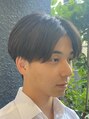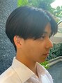 耳周りと襟足はスッキリさせた、2ブロックのハンサムセンタパートスタイル。センターパートにしやすいように前髪の方を少し長く残し前下がり気味にカット。後頭部も綺麗に丸みがでるよう長さを調整して骨格補正を。