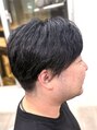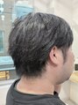 メンズショートバイヤスグラデーション毛量が多く頭のサイズ感がある為バイヤスでのステップ(刈り上げ)たのにする事でコンパクトになりやすい。シャープになり過ぎないように注意してナチュラルな仕上がりを意識しています。