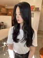センターパートのロングスタイルです。カラーは地毛ではなく深めのブルーブラックを乗せてしっかり黒い印象に染めています。スタイリングで顔まわりはカーラーを巻いて重くなり過ぎない印象に仕上げています。